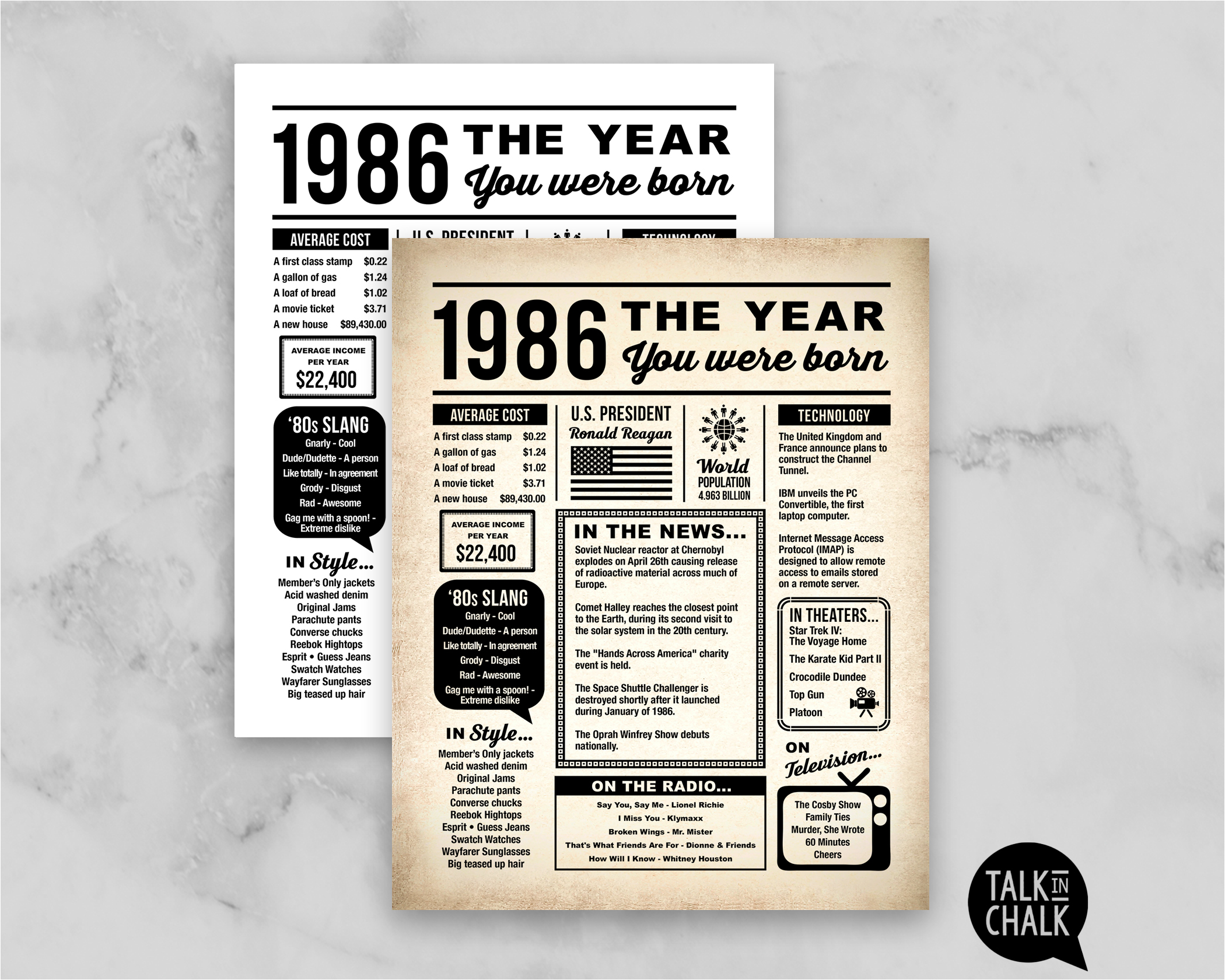 1986 The Year You Were Born Printable Newspaper Poster for 40th Birthday - Last Minute Gift