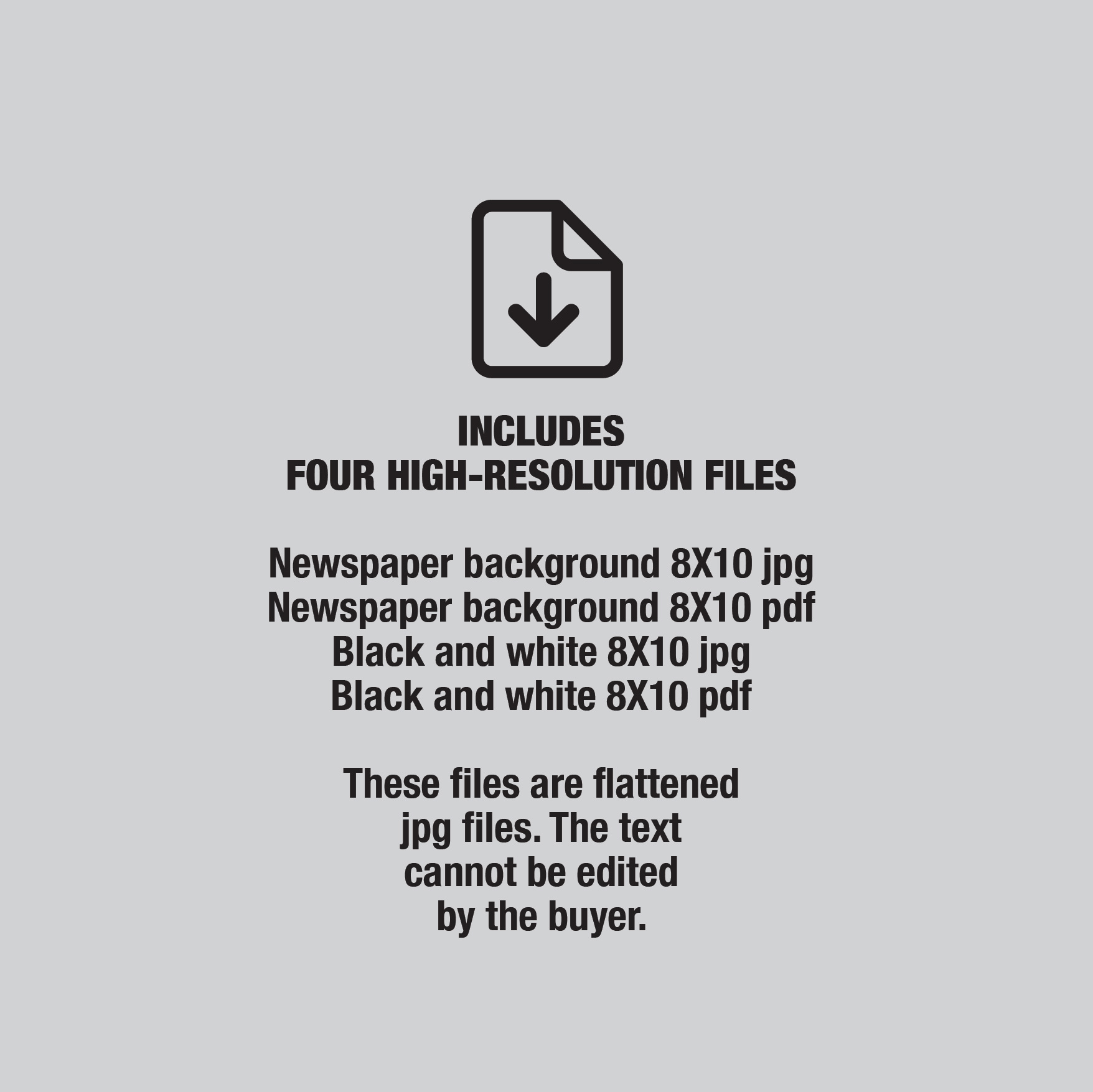 Includes 4 files, 8.5" x 11" jpg and pdf, 8x10 jpg white background, 8x10 jpg newspaper background