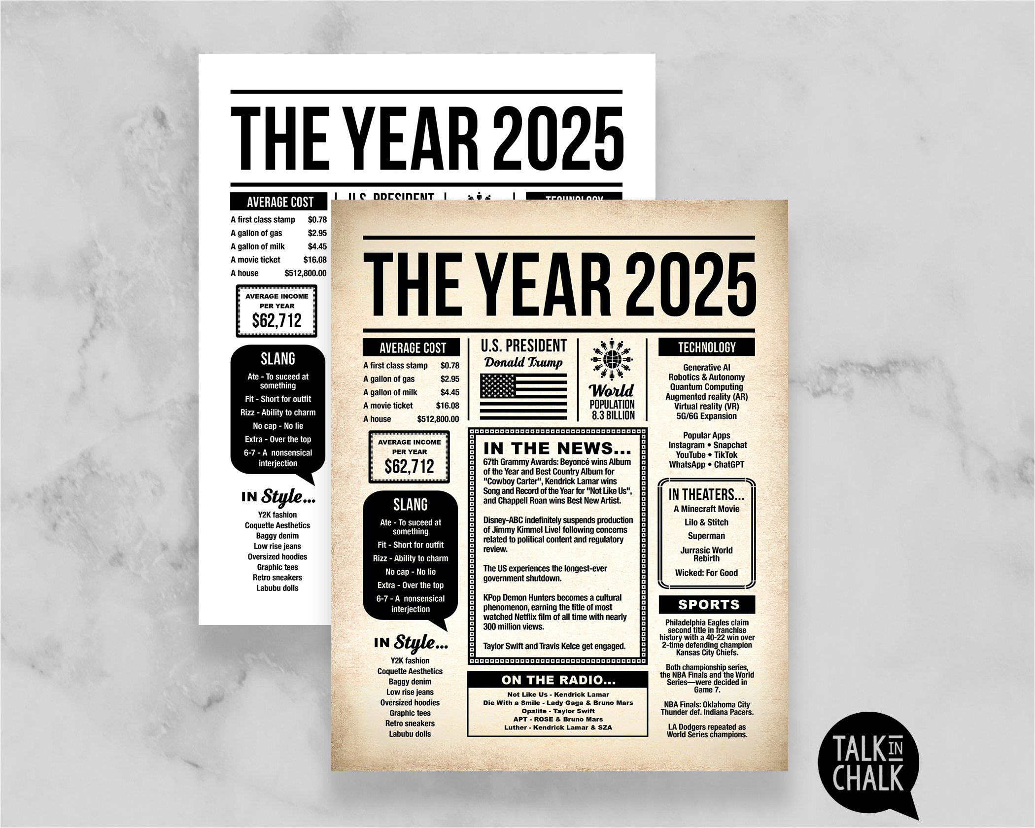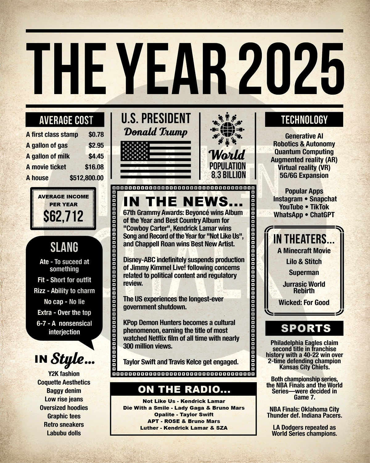 Step back into 2025 with this Back in the Day style printable! Packed with pop culture highlights, headlines, trends, and everyday details, this keepsake captures what made 2025 unforgettable — all in one clean, easy-to-read layout.