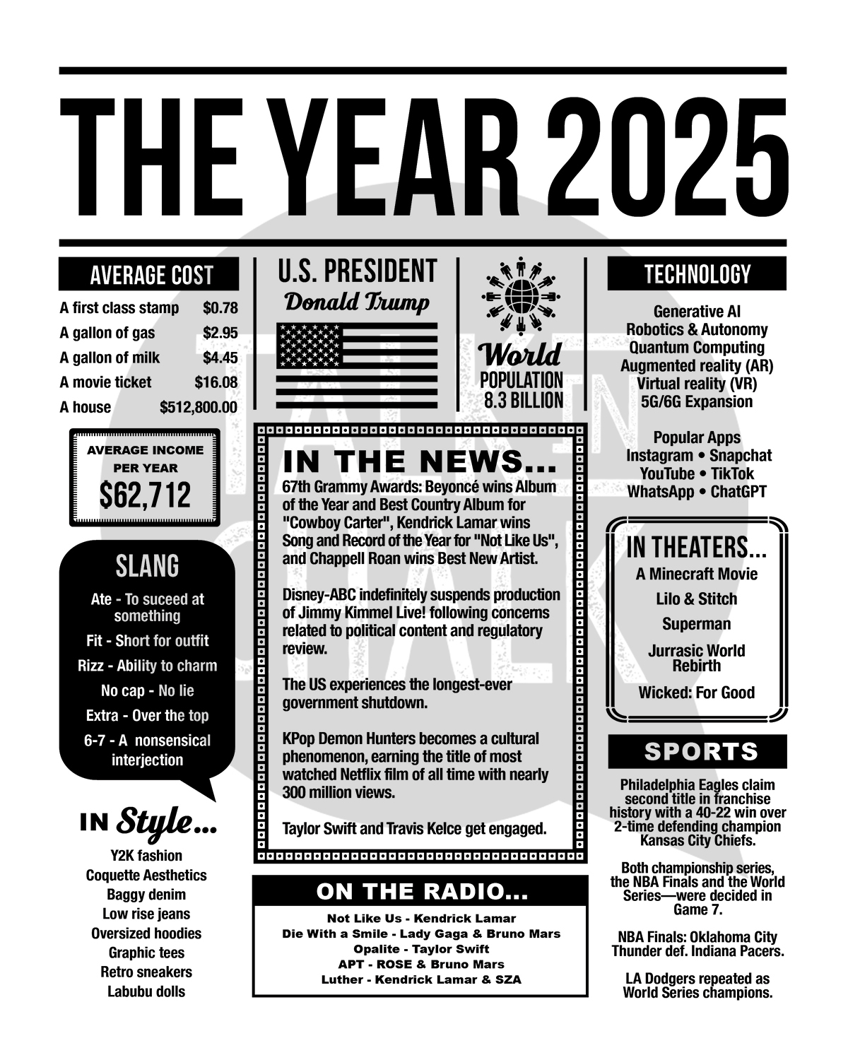 The Year 2025 Printable | What Happened in 2025 Fact Sheet | The Year in Review | Time Capsule Insert