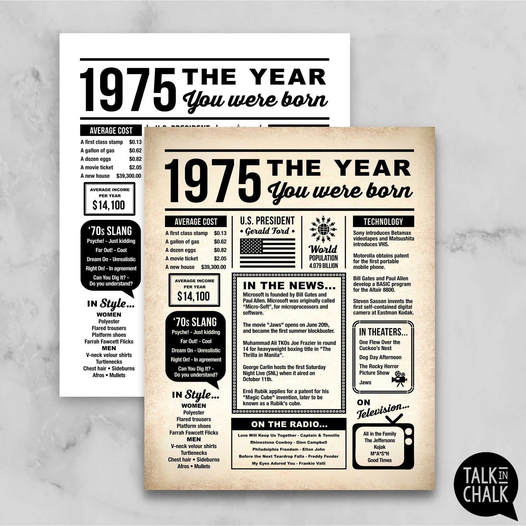 1975 The Year You Were Born Printable Newspaper Poster for 1975 Birthday - Last Minute Gift