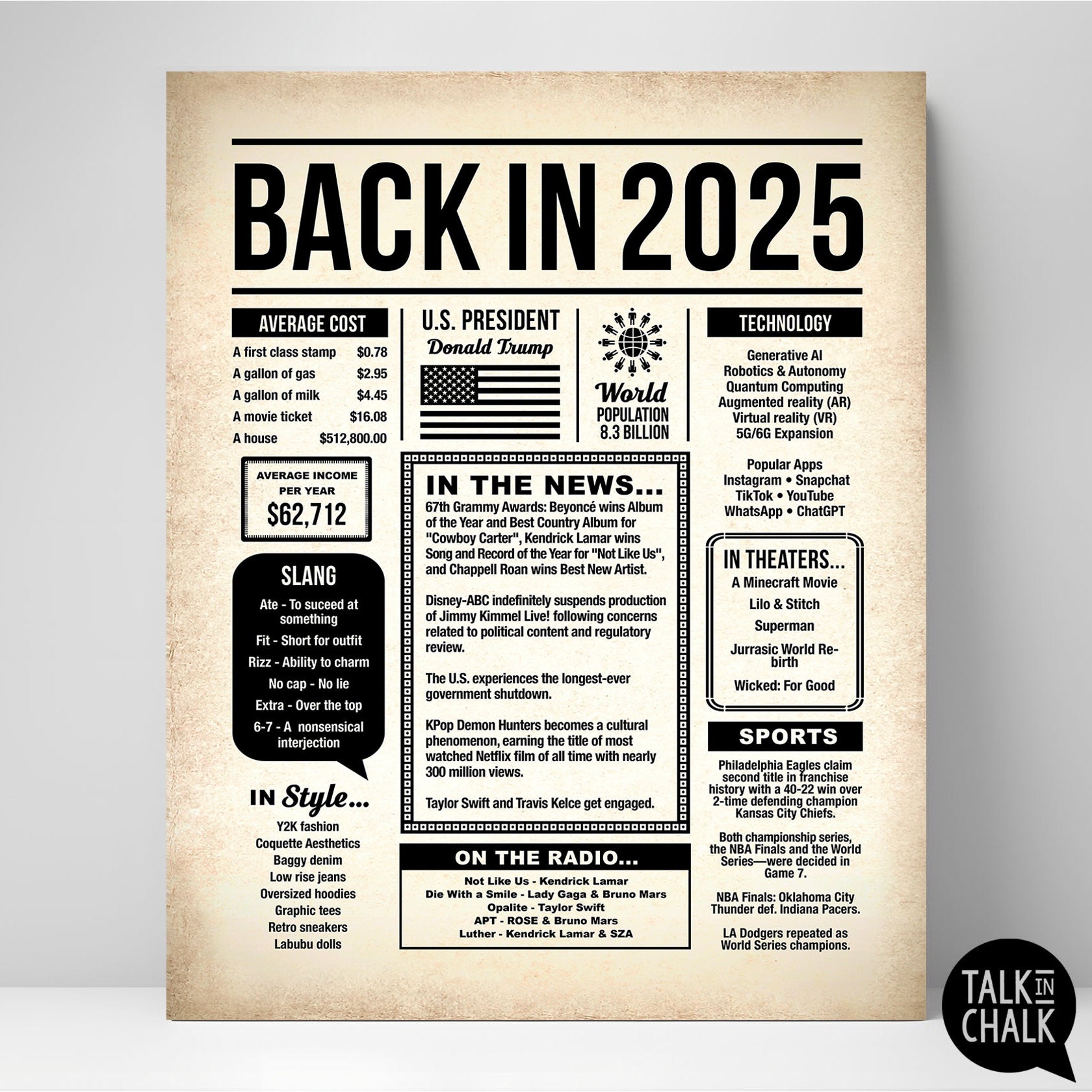 This "Back in 2025" printable newspaper poster is packed with fun facts, pop culture highlights, and major historical moments, this vintage-inspired design is a perfect conversation starter for any occasion.