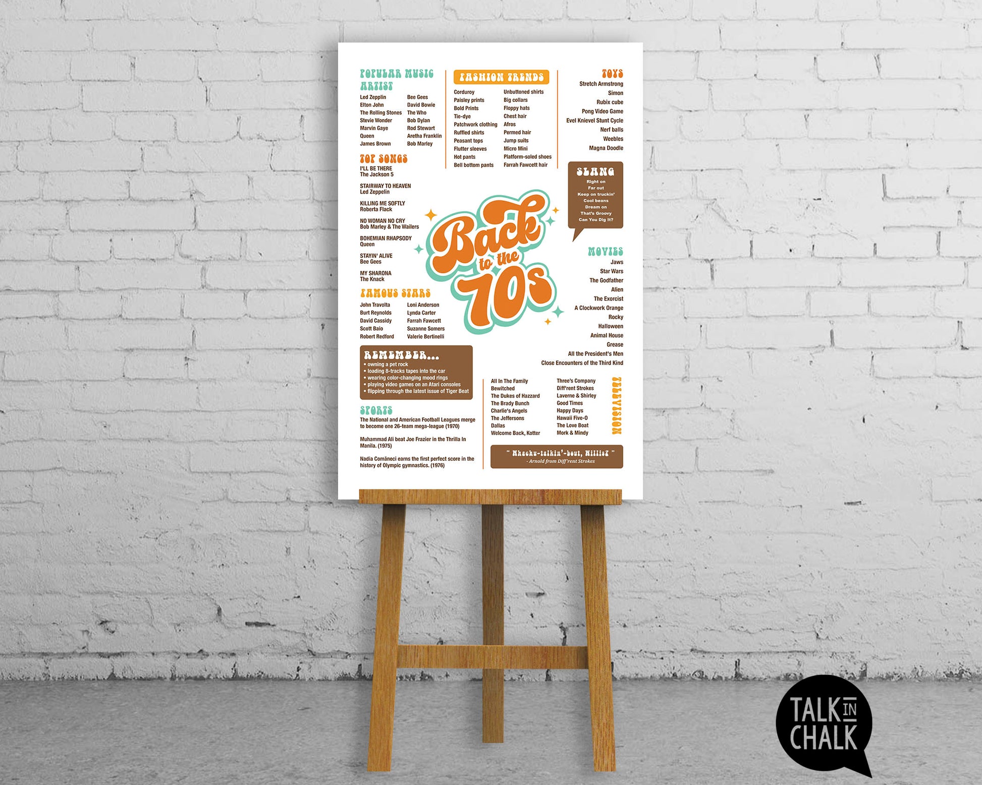 This 1970s nostalgia print makes a fun conversation starter and a thoughtful gift for anyone who remembers 8-track tapes, disco balls, Saturday morning cartoons, and staying up late to watch classic sitcoms.