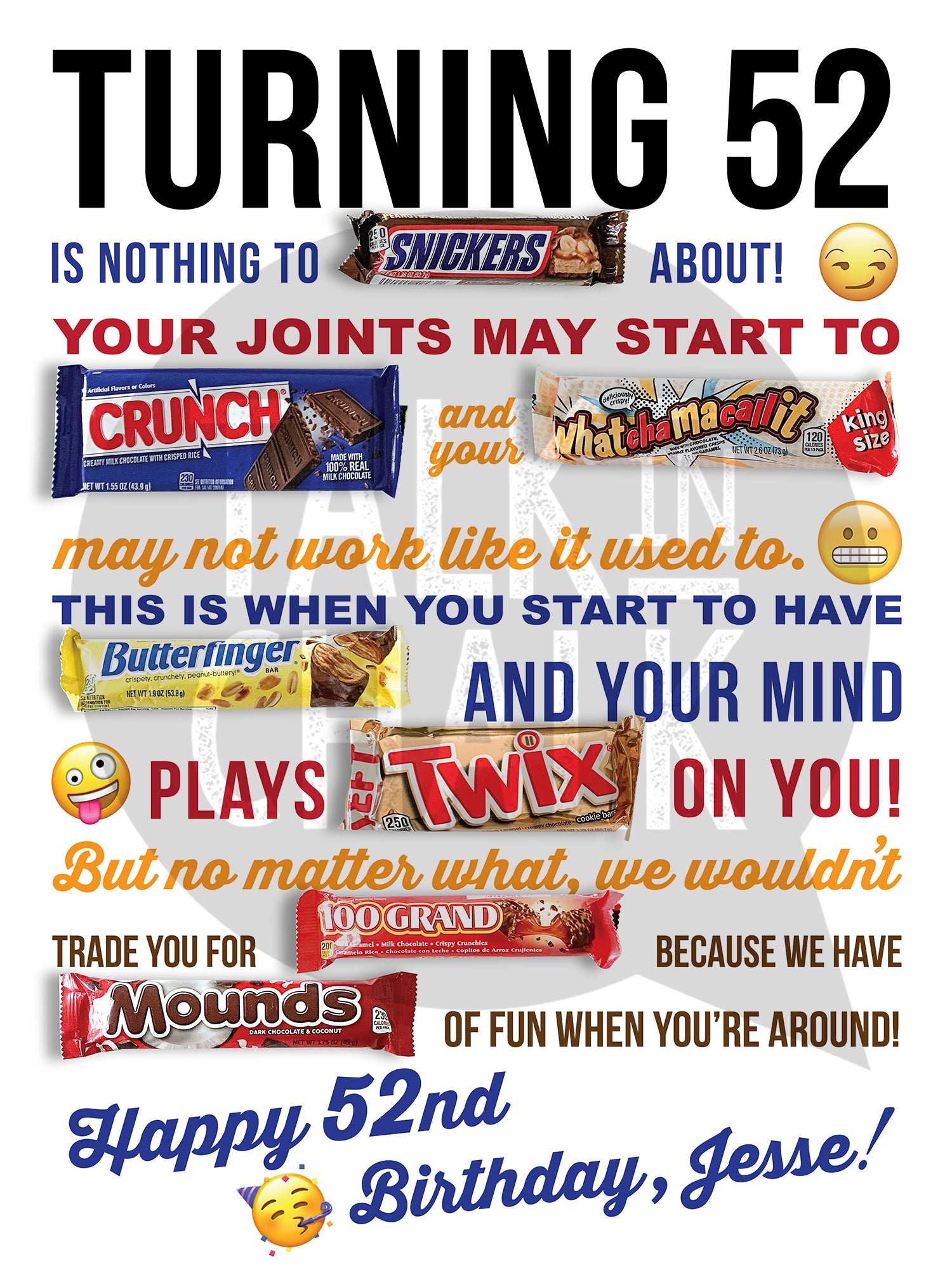 Featuring iconic candy bars like Snickers, Crunch, Butterfinger, Twix, Whatchamacallit, 100 Grand, and Mounds, this poster turns age-related aches and quirks into a clever, heartwarming message. Whether you're celebrating a 52nd birthday (like Jesse in the sample) or choosing your own milestone number, this customizable design is a fun and unique way to say "You're still a treat!"