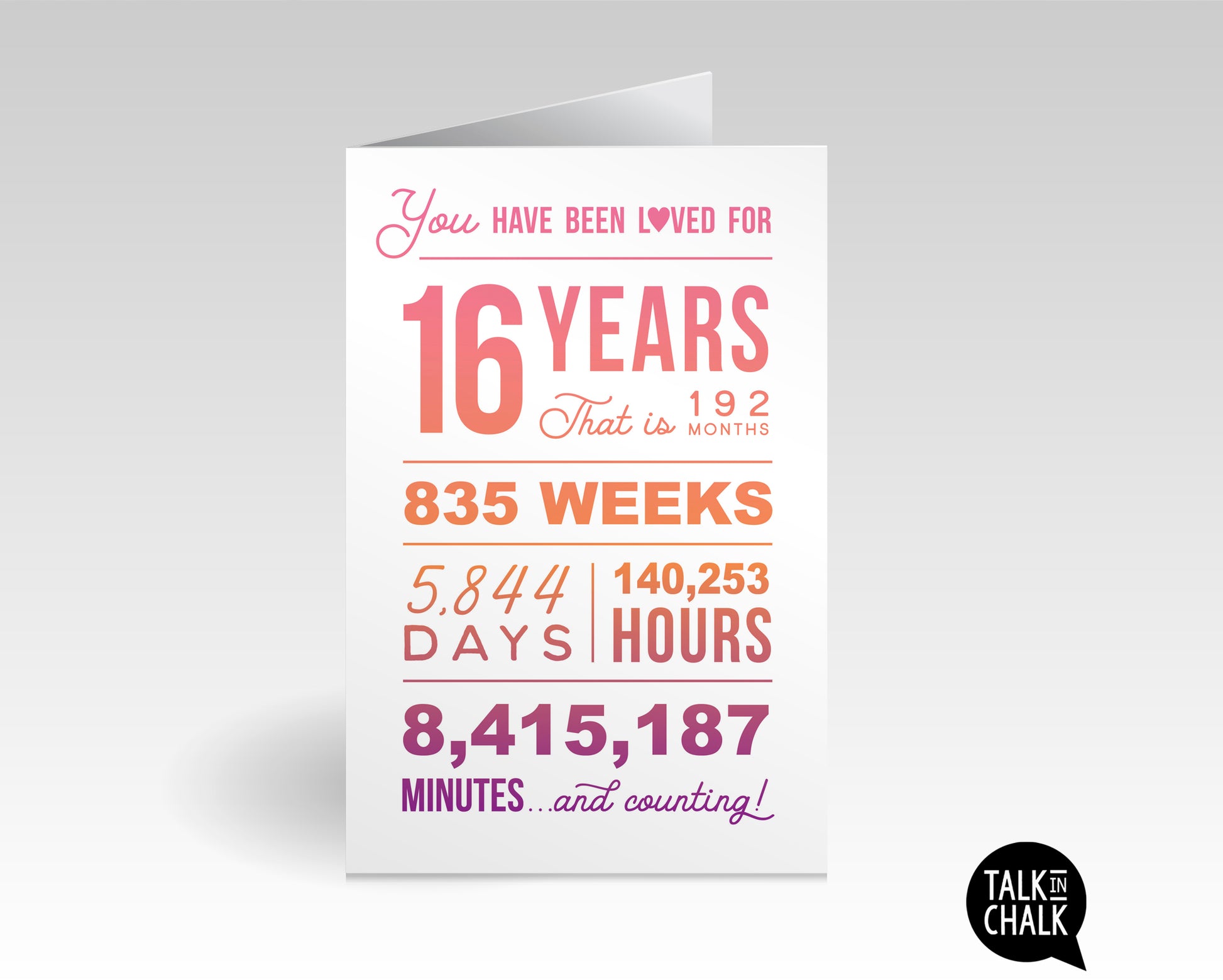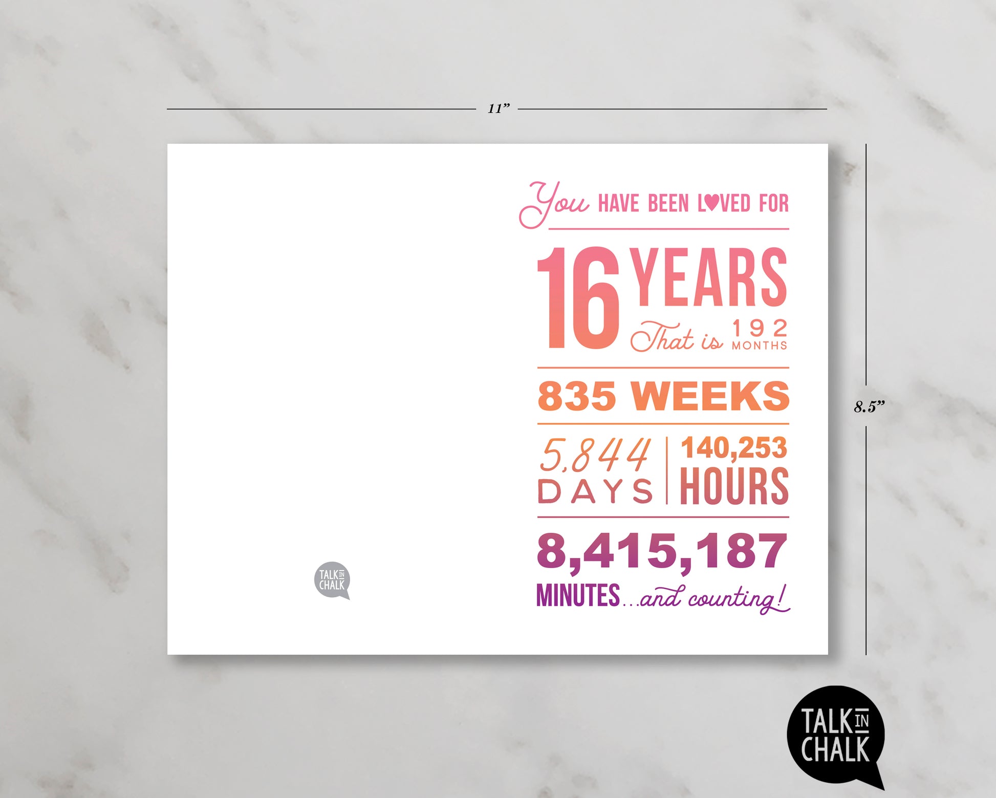 Celebrate a milestone birthday with this Sweet 16 Printable Greeting Card! This modern and heartfelt design breaks down 16 years into months, weeks, days, hours, and minutes—showing just how much love has filled every moment.